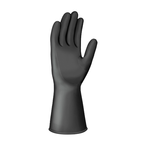 Compuesto 100% de látex natural. Color: Interior Negro / Exterior: Negro. Calibre: 35. Largo del guante: 12'' +/-. Tallas disponibles: 8 = M 9 = L