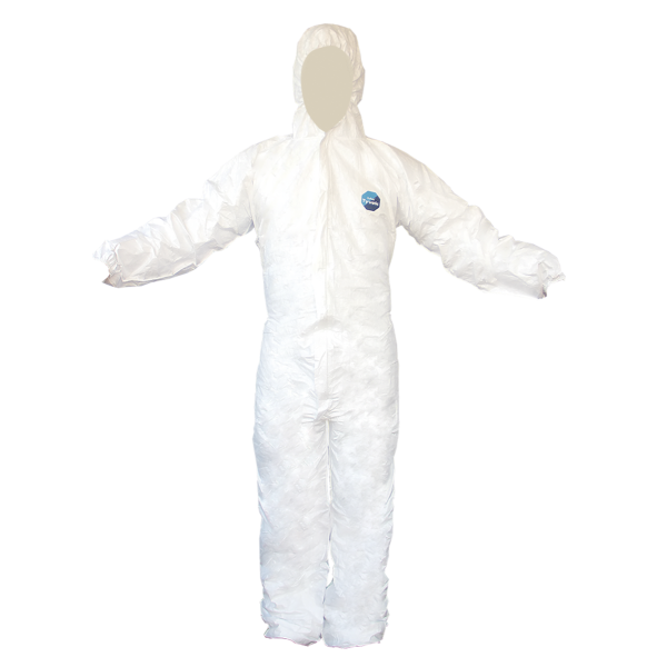 El traje está construído con Tyvek®, un No-Tejido de DuPont. El traje tiene tratamiento antiestático y bajo nivel de deshilachamiento. Tiene también ajuste elástico en muñecas y tobillos. Diseño ergonómico
